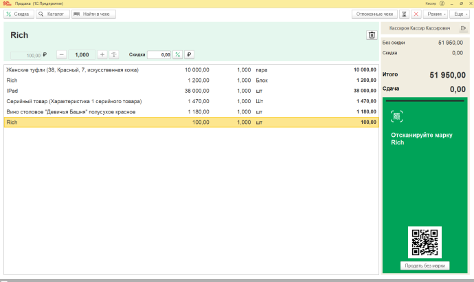 1С:РМК — это программа для автономной работы кассира на рабочем месте, с подключенным торговым оборудованием, в полном соответствии с текущим законодательством о розничной торговле. Обладает следующими возможностями, на которые стоит обратить внимание.